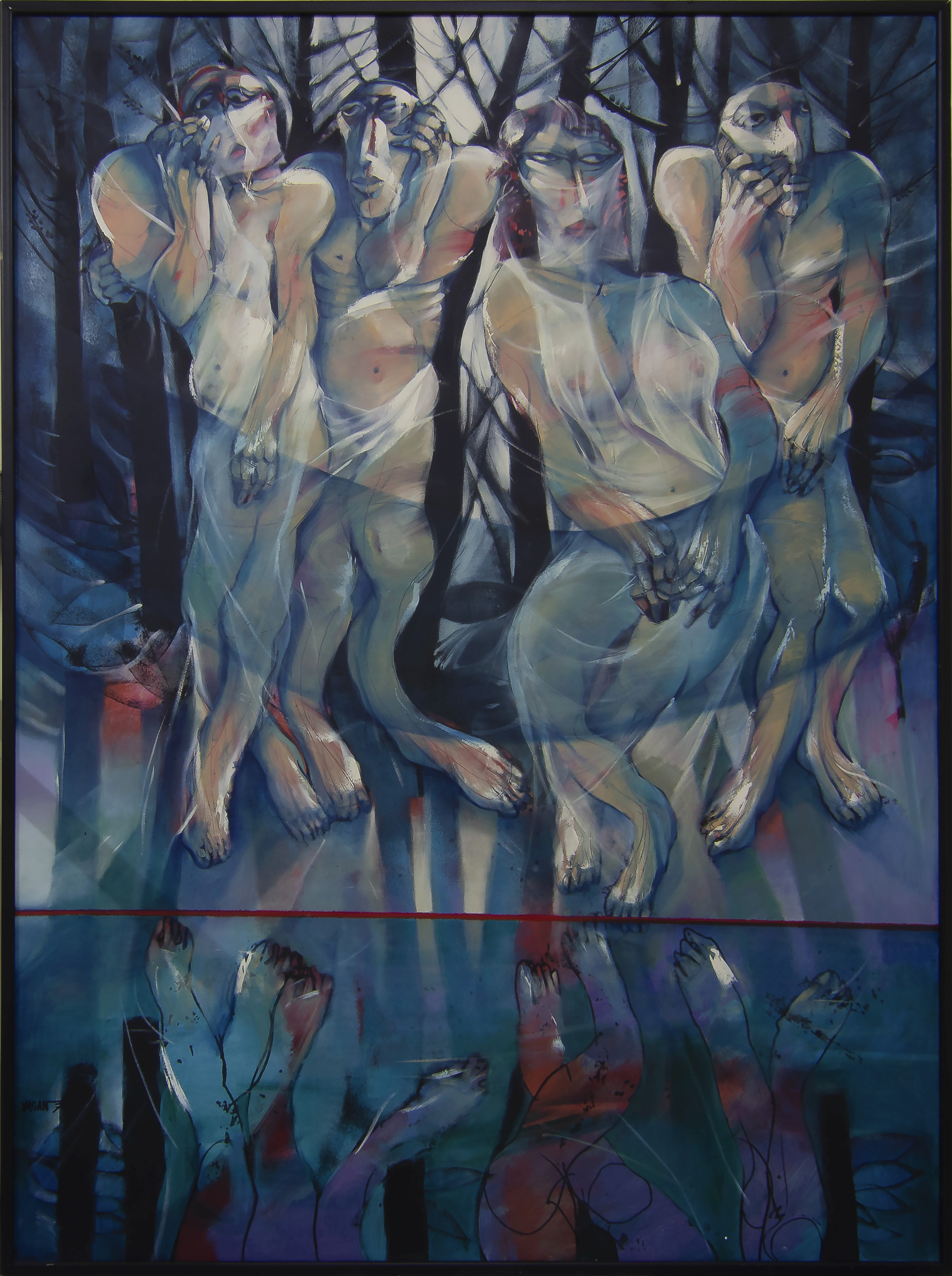 Focused on figuration, Yagan’s stylised bodies have serious, elongated faces, that are at many times depicted mid-movement. Depicting everything from café culture to the performing arts, his expressive and dynamic works are distinctive in the faces and bodies of their characters and feature a palette of predominately white, reds and blues.
