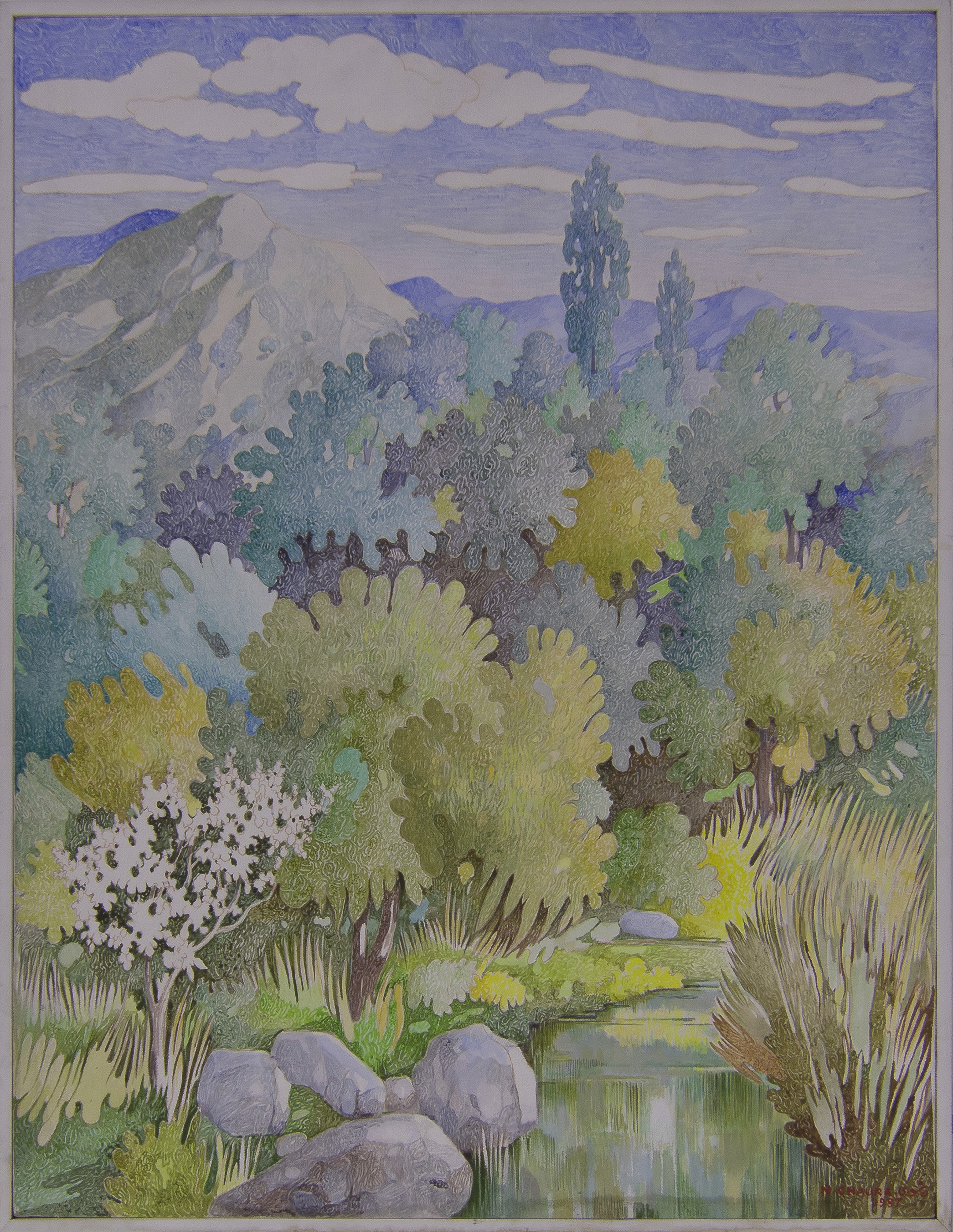 A well-known figure in the Syrian art scene, Nassir Chaura’s painting styles evolved over time while the theme of nature and landscapes remained his subject. “My love for nature was the main inspiration for me as we lived in an old wooden house surrounded by a small vegetable garden,” he once said.